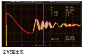 面積差比較可用來檢測待測物電容量的差異。面積差比較是測試的波形與樣品的波形不重疊的面積所占的比例,此比例的大小代表著待測物的電容量與樣品的電容量的差異,當電容量越大波形諧振的頻率會越低,電容量越小波形諧振的頻率越高。