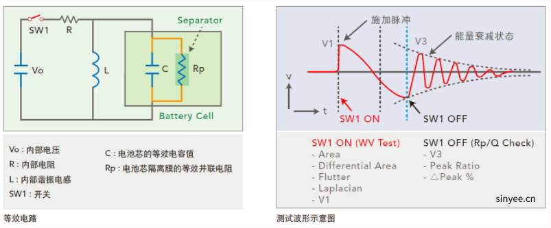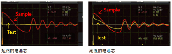 諧振波形中的第三個電壓峰值。當電池芯正負極板之間的絕緣不良或是隔離膜不存在時,在足夠的電場強度/電壓下會造成放電,能量的釋放會導致第三個電壓峰值的電壓比良品低。當電池芯的絕緣品質較差時,因為能量損失的較快也較多,也會導致第三個電壓峰值的電壓比良品低。