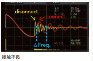 接觸檢查功能利用諧振頻率的差異來檢測是否有連接到待測物。由于當沒有碰觸好或是沒有接到待測物做測試時,電容量會比有接待測物時還要小很多,所以波形諧振的頻率會變高,并可利用此頻率差異做檢測。使用者可依各自的需求對接觸檢查的靈敏度做調整,可將百分比的界線提高來增加接觸檢查的靈敏度或是將百分比的界線降低來減少接觸檢查的靈敏度。