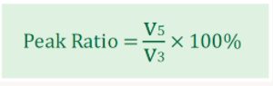 波峰比是用來檢測鉛酸電池芯正負極板之間的絕緣品質。波峰比是波形的第五個電壓峰值與第三個電壓峰值的電壓比例,當電池芯的等效并聯電阻(Rp)較小或絕緣的品質較差時,因為能量損耗的較多、較快,導致第五個電壓峰值變得更小,所以絕緣品質較差的波峰比會比絕緣品質較好的波峰比更小。波峰比的大小表現出電池芯正負極板之間絕緣品質的狀態。