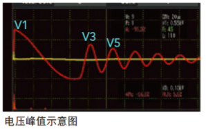 諧振波形中的第一個電壓峰值。當電池芯正負極板之間的絕緣不良或是隔離膜不存在時,在足夠的電場強度/電壓下會造成放電,會導致第一個電壓峰值比樣品的第一個電壓峰值低。
