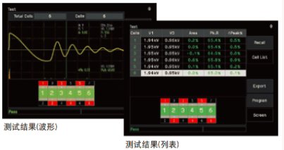 · Chroma 19311系列可透過內部電感與電池芯的諧振波形來分析電池芯的絕緣品質差異。檢測的判定功能共有8種:面積比較(Area)、面積差比較(Diff-Area)、顫動量偵測(Flutter)、二階微分偵測(Laplacian)、第一電壓峰值判定(V1)、第三電壓峰值判定(V3)、波峰比(Peak Ratio)及波峰差比(ΔPeak %)。