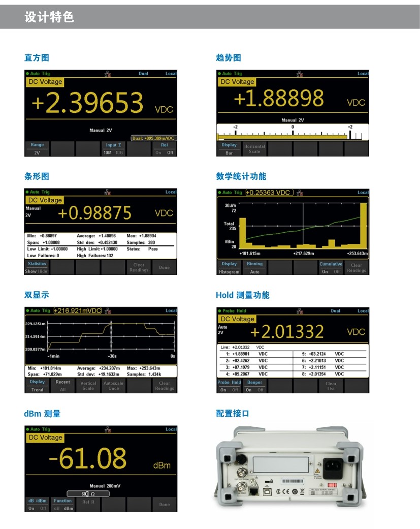 ● 最大值、最小值、平均值、標準差、相對測量、條形表,直方圖,趨勢圖,dB/dBm,限值等