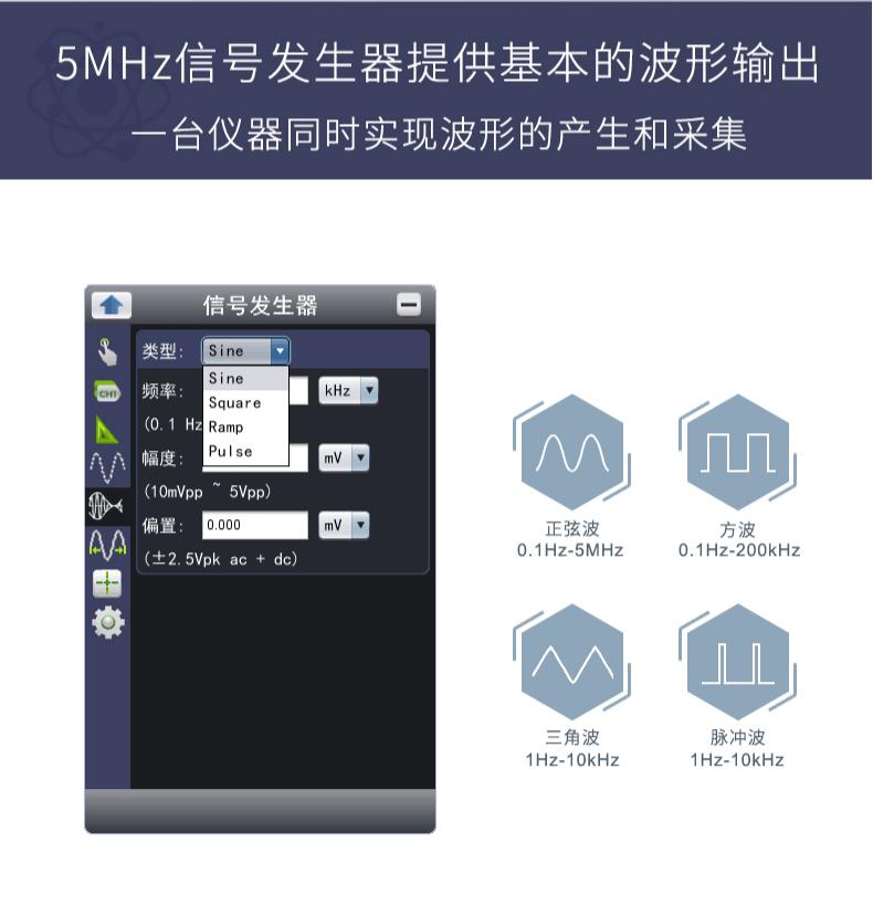標準波形 | 正弦波(0.1 Hz - 5 MHz)、矩形波(0.1 Hz-200 kHz)、鋸齒波(1 Hz-10 kHz)、脈沖波(1 Hz-10 kHz) |