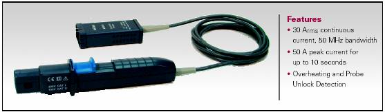 如果需要測(cè)試的電流信號(hào)頻率較高,可以使用LeCroy最高帶寬電流探頭CP031。CP031提供100MHz帶寬,30Arms持續(xù)電流測(cè)試和50Arms的峰值電流測(cè)試。探頭外形小巧,非常適合擁擠狹窄的電路板測(cè)試。