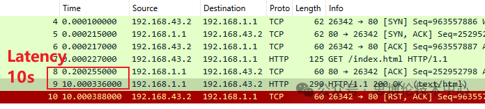 如果我們不使用Think參數(shù)來保持連接,而是在服務器側通過服務器延遲響應的方式來控制連接的時長,Avalanche模擬的服務器會在收到HTTP請求后等待Lantency的時間計時完成再回復響應數(shù)據(jù),由于此時HTTP的會話也處于保持階段,因此采用這種方式來控制連接時長的方法我們稱之為七層并發(fā)。