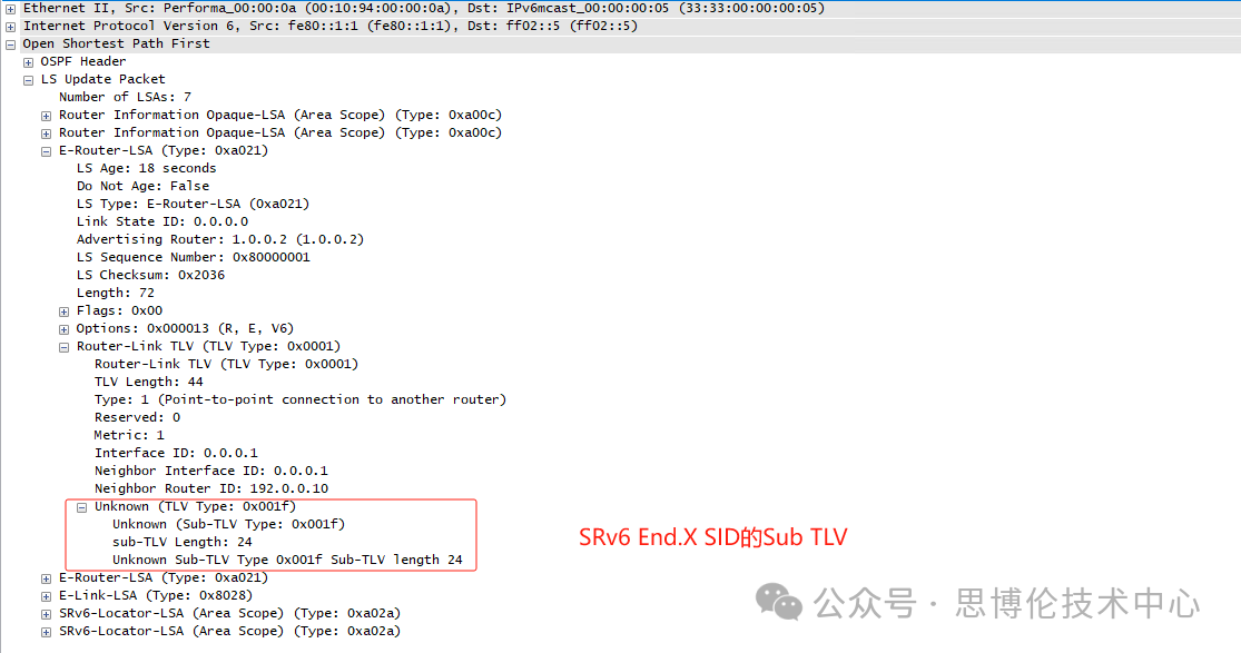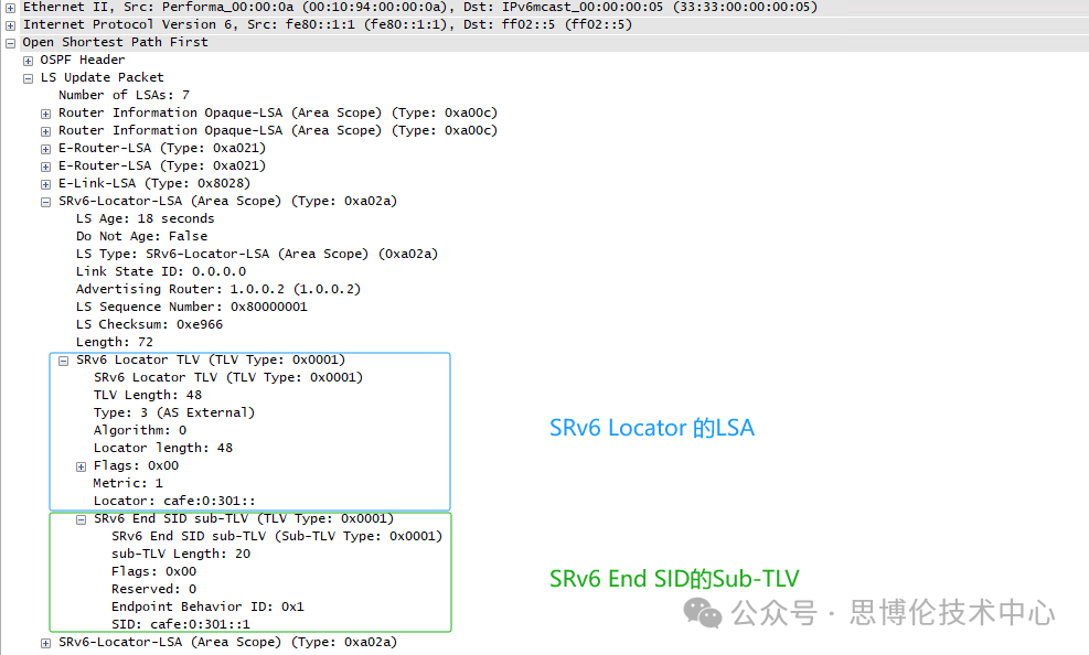--配置完成,點(diǎn)擊Start Device并通告OSPFv3 LSA,抓包可觀察OSPFv3報(bào)文解析后的SRv6 字段