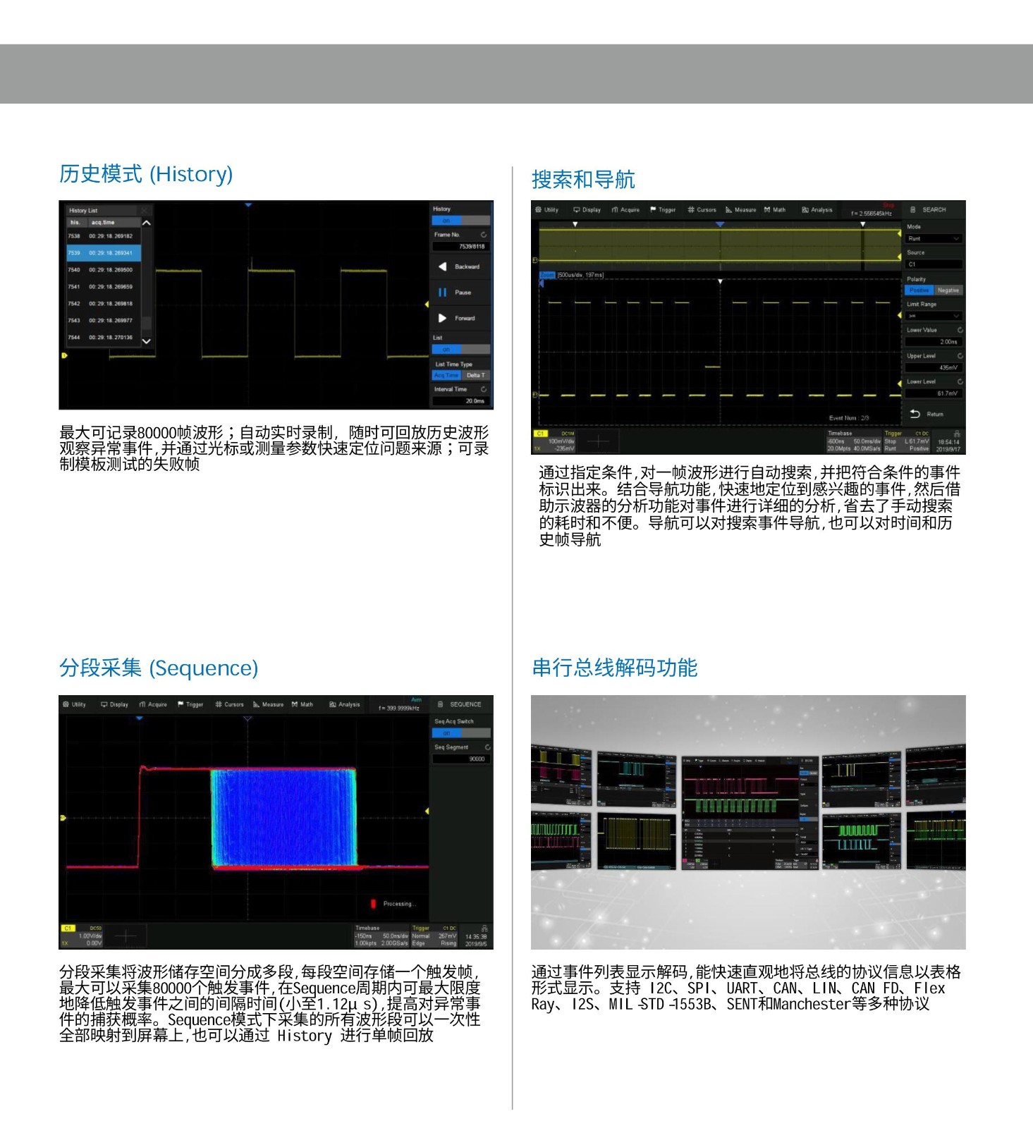 ·強大的串行解碼分析,支持的協議包括標配的I2C、SPI、UART、CAN、LIN和選配的CAN FD、I2S、FlexRay、MILSTD-1553B、SENT、Manchester和ARINC429