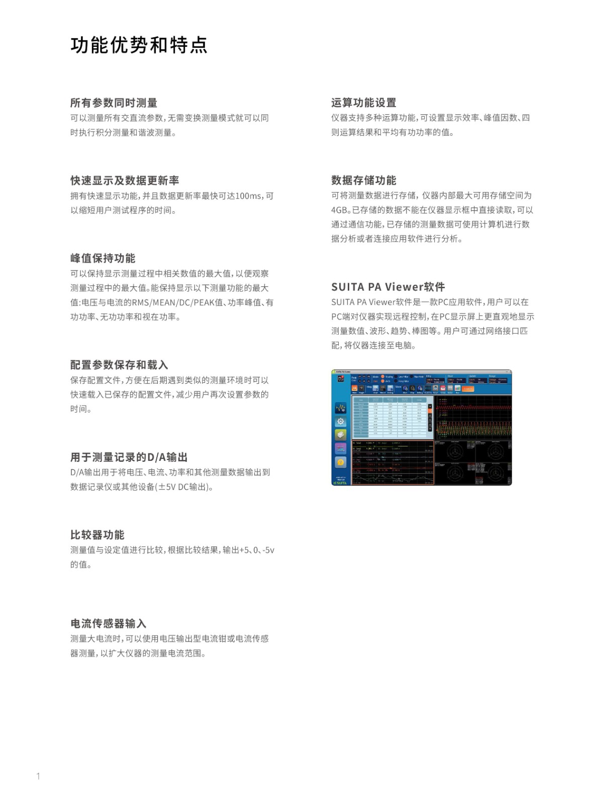 上位機(jī)軟件支持,數(shù)據(jù)分析更直觀搭配自研上位機(jī)軟件,可對(duì)測(cè)量數(shù)據(jù)進(jìn)行處理分析,支持對(duì)所有測(cè)量參數(shù)數(shù)值進(jìn)行實(shí)時(shí)顯示,生成各次諧波數(shù)據(jù)、諧波柱狀圖、趨勢(shì)圖和波形圖,支持同步顯示與報(bào)表導(dǎo)出。產(chǎn)品參數(shù)SPA3000