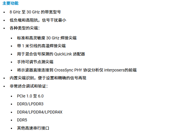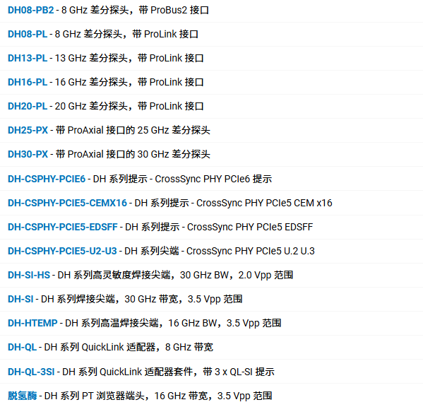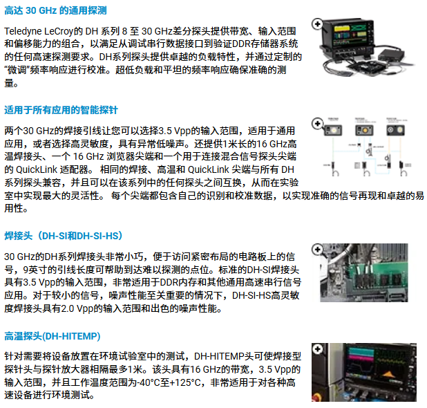 DH 系列 8 至 30 GHz 有源差分探頭提供高輸入動態范圍、大偏置能力、低負載和出色的信號保真度并具有多種連接選項。
